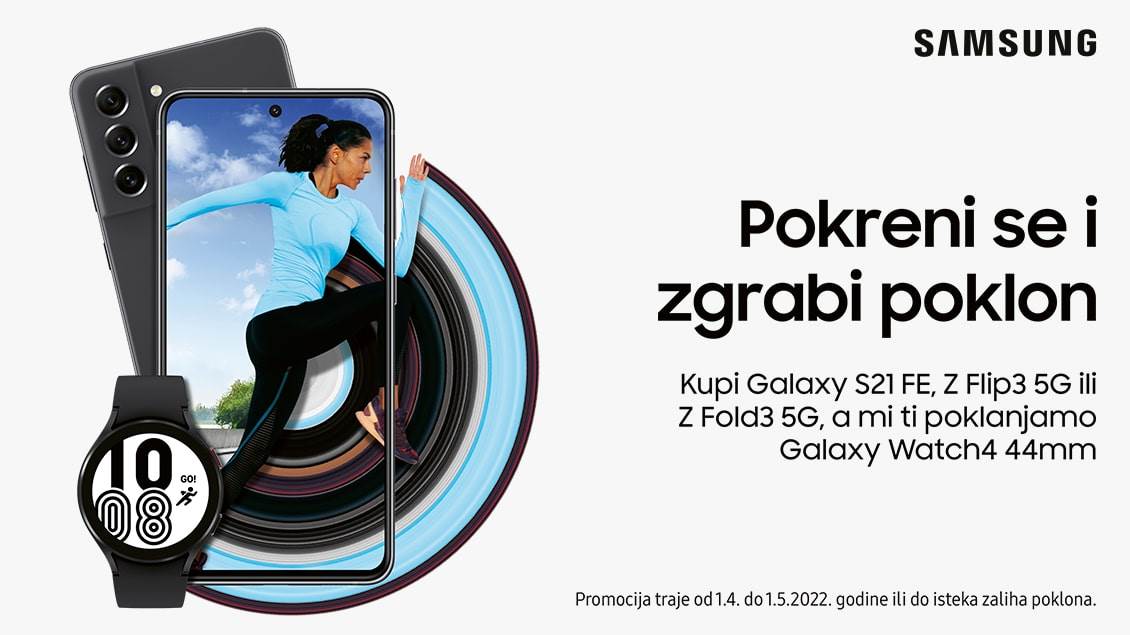 Ne propustite priliku da se uključite u novu i sjajnu promociju Samsunga: ako kupite telefon Samsung Galaxy S21 FE, Z Fold3 ili Z Flip3 dobićete na poklon sat Galaxy Watch4 44mm u crnoj boji! Ovo je pravi trenutak da se odvažite i uz prestižni uređaj dobijete i poklon koji će vam kao pratilac u vežbi i pokretu mnogo značiti.