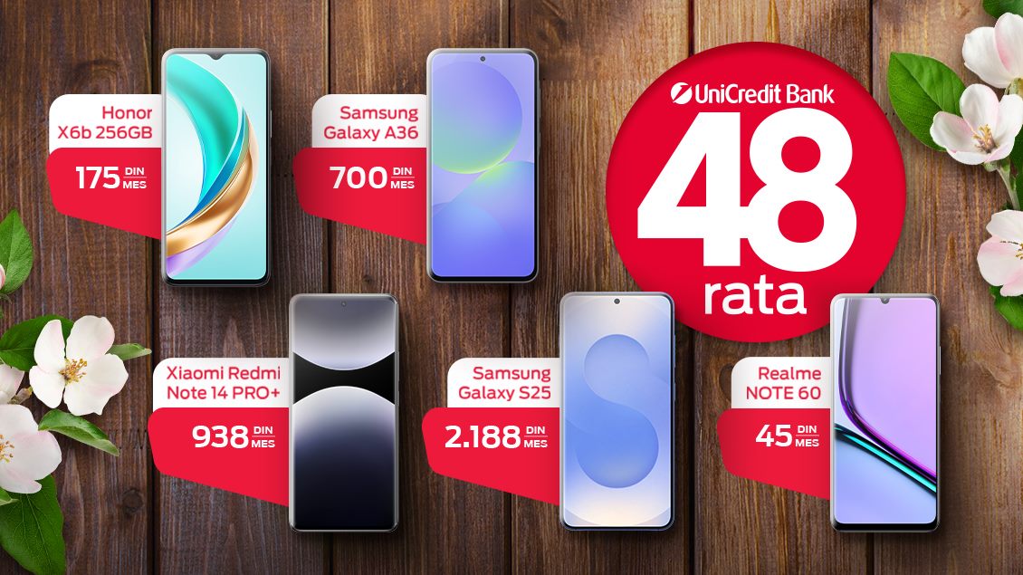 - Kupovinu na 48 rata putem UniCredit banke (važi za Samsung Galaxy S25, Samsung Galaxy A3 i Xiaomi Redmi Note 14 Pro Plus)